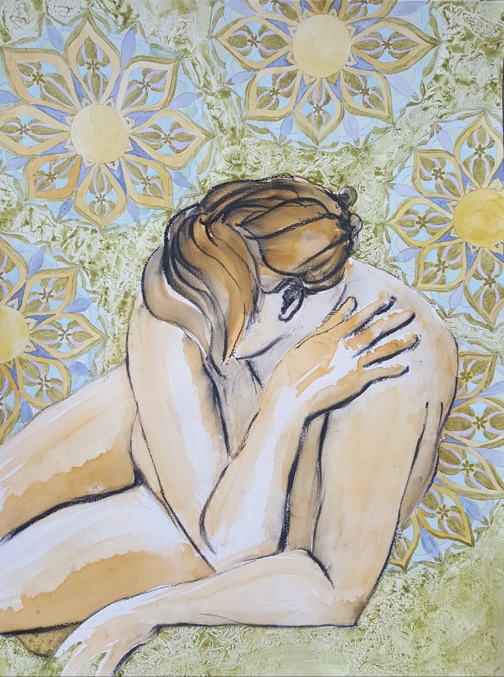 Wall panels and desktop sculptures. Figures in glass paint drawn from live models in the energetic Bay Area figurative style.